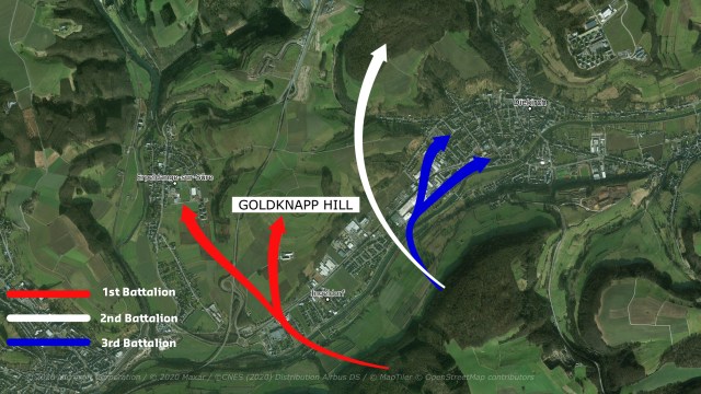 The 2nd Battalion crossed east of Ingeldorf and also received small arms fire from the Germans dug in on Goldknap hill. They suffered more casualties than the 1st Battalion.